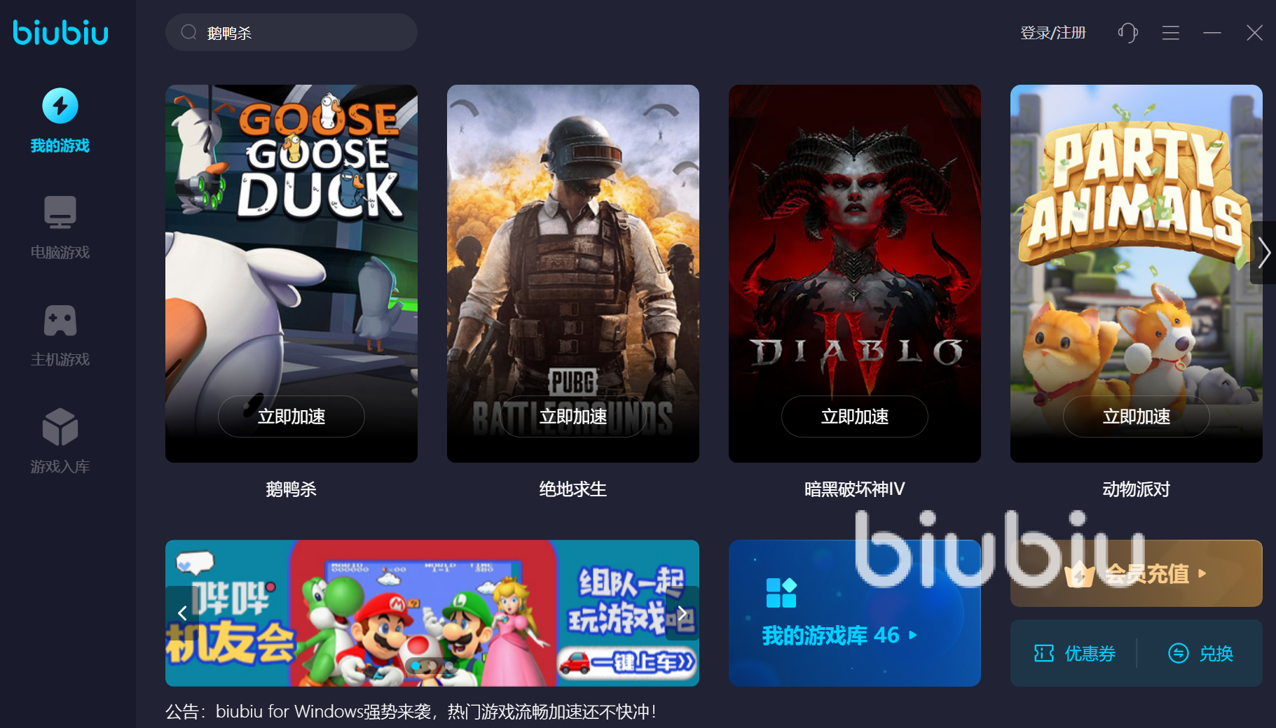 游戲的玩法非常的有趣,平民,殺手以及攪局的混子,想要獲得最后的勝利就的把其中所有的壞鴨鴨踢出局,或者是快速的完成下達的任務就可以贏得最后的勝利。對于這個快節(jié)奏的游戲來看,如果因為網(wǎng)速的問題導致卡頓從而錯過了一個好的時機,那么很大幾率走向失敗,這就會讓很多的玩家惱火,所以運行游戲的時候啟用加速器是非常有必要的,小編推薦大家使用biubiu這款加速神器。