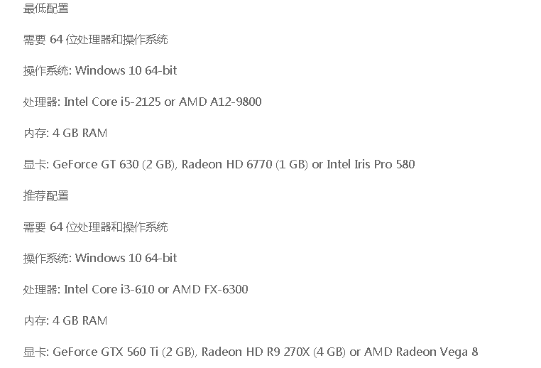 這款游戲?qū)τ陔娔X的配置要求其實(shí)是比較低的,只需要WIN10的系統(tǒng)以及64位處理器就可以了,內(nèi)存4G以上就可以正常運(yùn)行?;旧洗蟛糠滞婕业碾娔X都是可以帶動(dòng)起來(lái)的,具體配置要求如下,小伙伴們可以根據(jù)小編提供的配置要求來(lái)更新自己的電腦,以確保游戲的順利運(yùn)行。
