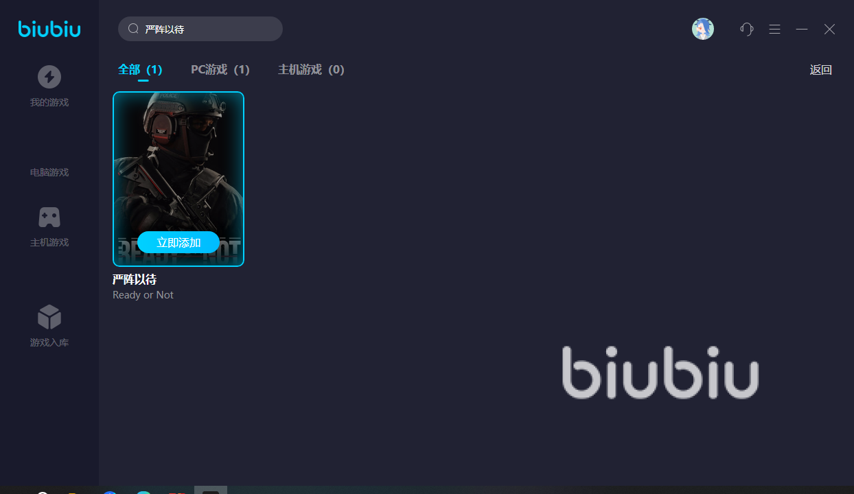 之后biubiu的操作極其簡(jiǎn)單,下載好安裝biubiu之后小伙伴們僅僅只用打開(kāi)biubiu搜索嚴(yán)陣以待游戲添加,之后在biubiu啟動(dòng)游戲就可以了,不需要先打開(kāi)嚴(yán)陣以待游戲,也不需要嚴(yán)陣以待游戲的玩家們?cè)偃ミM(jìn)行其他的操作。