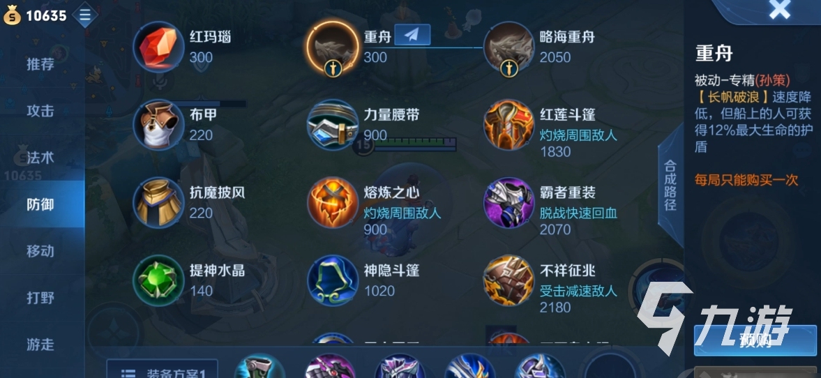 重舟是初級專屬裝備,在每場對決時(shí),玩家可以購買一次。重舟具有被動技能長帆破浪,提升孫策的實(shí)力,讓速度降低,同時(shí),讓孫策擁有12%生命值的護(hù)盾,增強(qiáng)孫策的防御力。