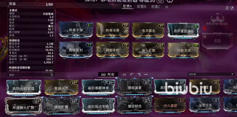 如果想要追求最佳暴力流的話,大家可以參考一下第一張圖的配裝方案。靜電勢(shì)能發(fā)射器即使到現(xiàn)在也是一款非常強(qiáng)力的武器,搭配上合理的配卡能夠達(dá)到非常震撼的清怪效果。