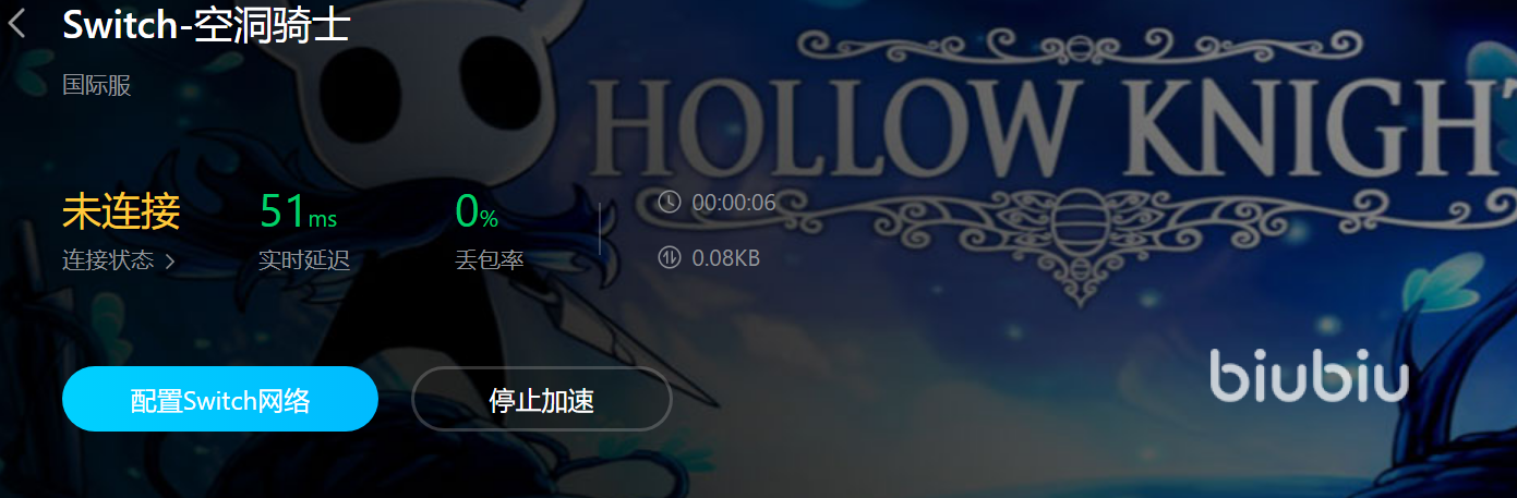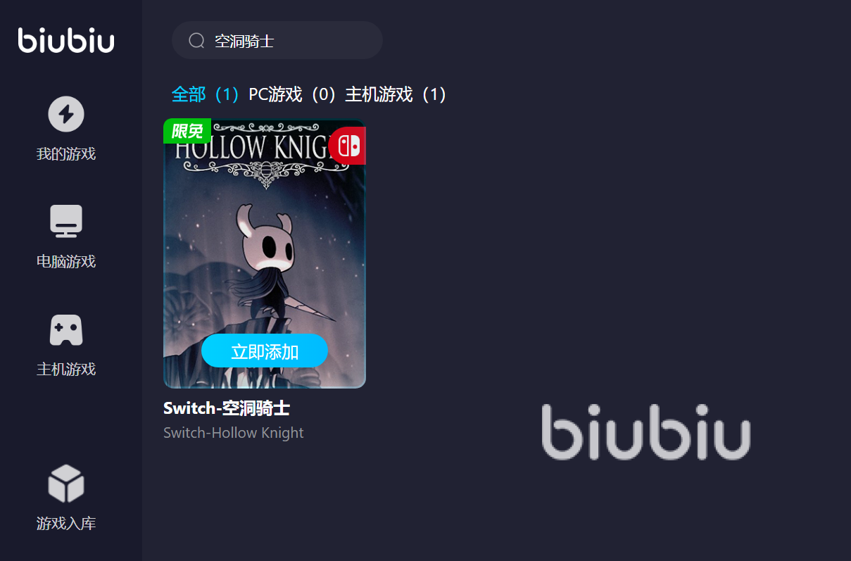 biubiu加速器支持對(duì)空洞騎士這款游戲加速,我們?cè)诩铀倨魃纤阉骺斩打T士,可以查看到這款游戲的switch版本,我們將其立即添加到我的游戲中,之后可以進(jìn)行加速。