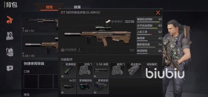 第二個要向大家推薦的就是DT MDR這把突擊步槍,這把武器的后坐力控制水平比MK14還要出色,但是精準度相對而言就要差一些。射速方面和MK14是平分秋色的,綜合的性能上比MK14還是要強一些的。但是DT MDR這把武器的獲取難度比MK14比較高,而且非常吃配件,所以不是太建議新手玩家去追求使用。推薦給DT MDR搭配上鋁制握把、緊湊型鏡座、5.56消音器、4x32倍鏡、緊湊型的瞄具軌等功能配件。