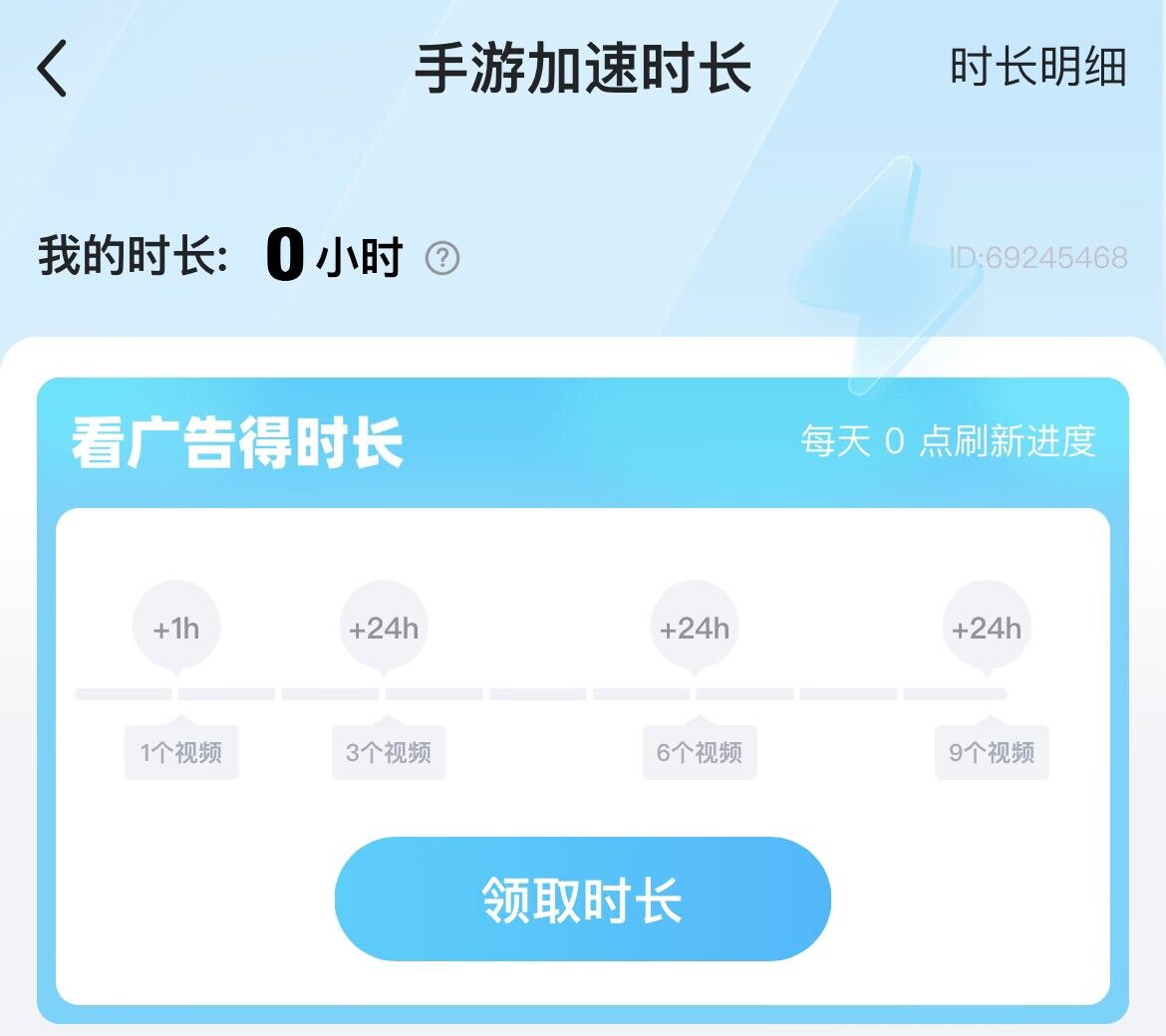 新人注冊(cè)之后是能夠體驗(yàn)免廣告的三天加速體驗(yàn),如果有不經(jīng)常玩游戲的寶子,還可以通過(guò)觀看視頻來(lái)獲取加速時(shí)長(zhǎng),基本上幾個(gè)視頻獲取的時(shí)間就夠玩家需求了。軟件每次只能夠給一款游戲加速,退出游戲的同時(shí)記得關(guān)閉加速。