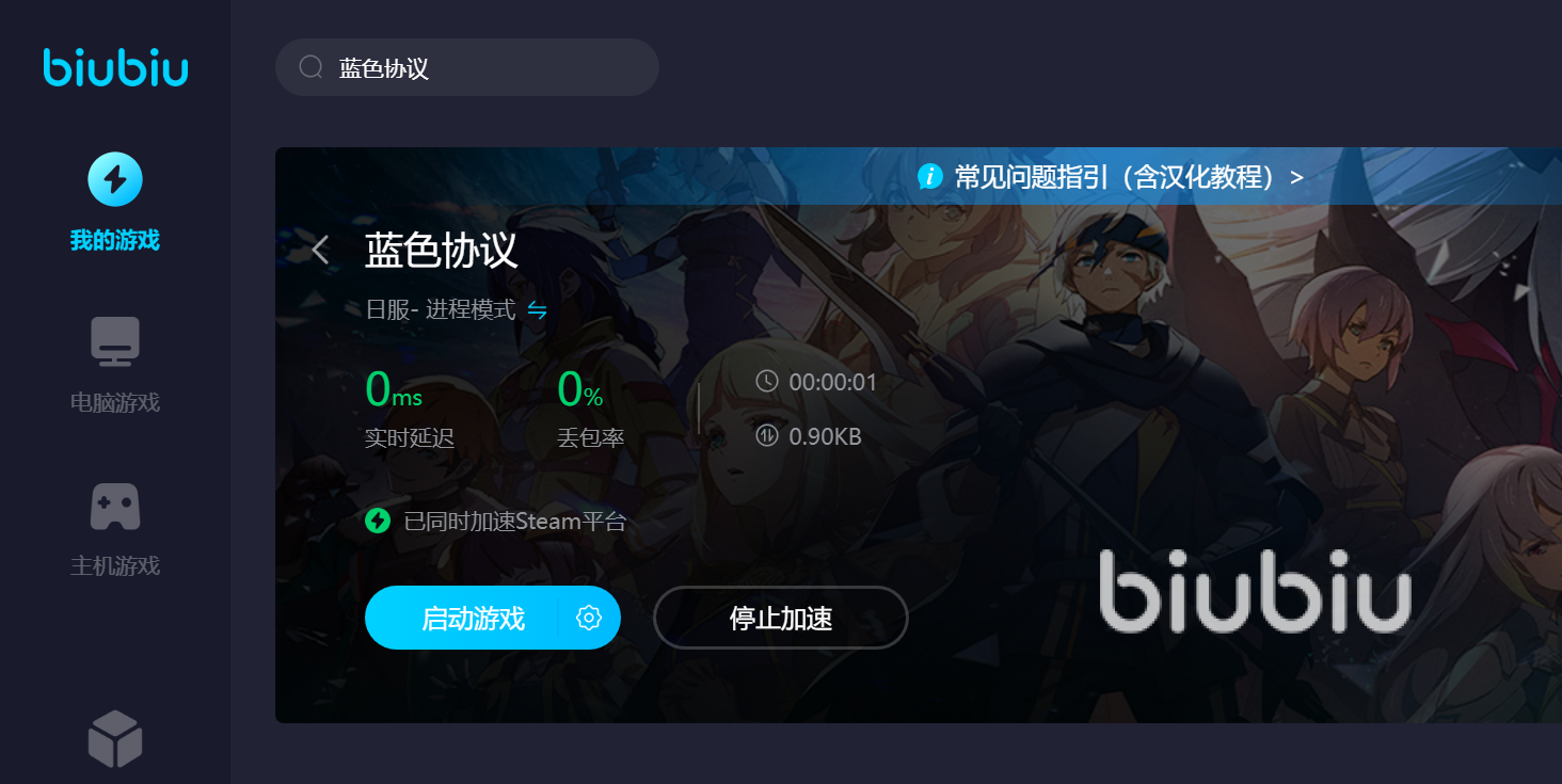 用戶只需要注冊(cè)登錄并且完成實(shí)名,在首頁上搜索“藍(lán)色協(xié)議”,即可看到PC游戲欄的游戲,點(diǎn)擊添加到“我的游戲”一鍵加速啟動(dòng),同時(shí)加速steam平臺(tái),看到每秒的延遲率與丟包率,加速效果看得見。