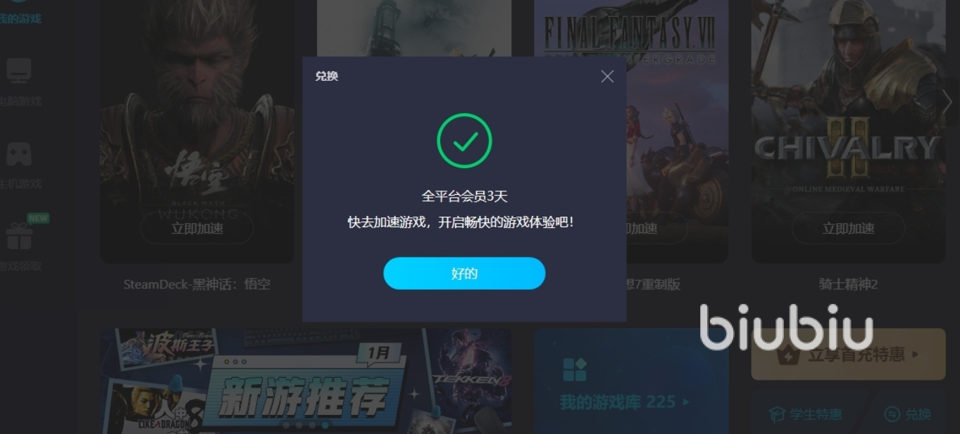 而除了擁有便捷的特點外,biubiu給到各位的福利也非常多,首次去使用的新用戶,能夠享受到24h的免費加速,當然了只要大家是平臺的用戶,通過首頁還能領取3天的加速機會,具體操作方法就是得在兌換窗口通過小寫的方式來輸入【biubiu不卡頓】,記得每個用戶只能領取一次哦。