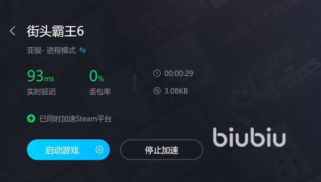 然后,一鍵開啟加速。在軟件上方搜索欄中輸入街霸6,找到相應(yīng)的版本、服務(wù)器專區(qū),打開加速。biubiu支持一鍵加速和停止加速,用戶只需要簡單三個步驟,智能設(shè)定加速。