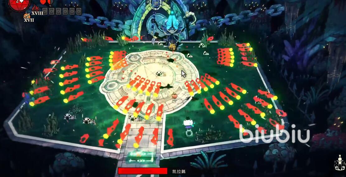 來到最后的戰(zhàn)斗階段,對(duì)手釋放的彈幕會(huì)越來越多,范圍也會(huì)變得更加的廣泛。不過小編建議玩家們直接沖入彈幕的縫隙當(dāng)中,隨著彈幕的消散,這些縫隙會(huì)變得越來越寬,剛好可以讓玩家們躲避敵人的反擊。最終,使用多次武器攻擊即可擊敗凱拉鰢。