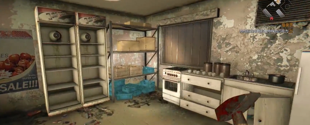 其次是【巧克力】的部分,這個(gè)房屋內(nèi)的門口處也有很多的喪尸,玩家們可以使用爆竹來吸引注意力引開喪尸,然后再馬上開門,在店里有零星的兩個(gè)喪尸。在店內(nèi)收銀處可以看到有一扇門,從這里進(jìn)門,可以來到店鋪的倉庫內(nèi)。在倉庫的籃子中可以得到巧克力。