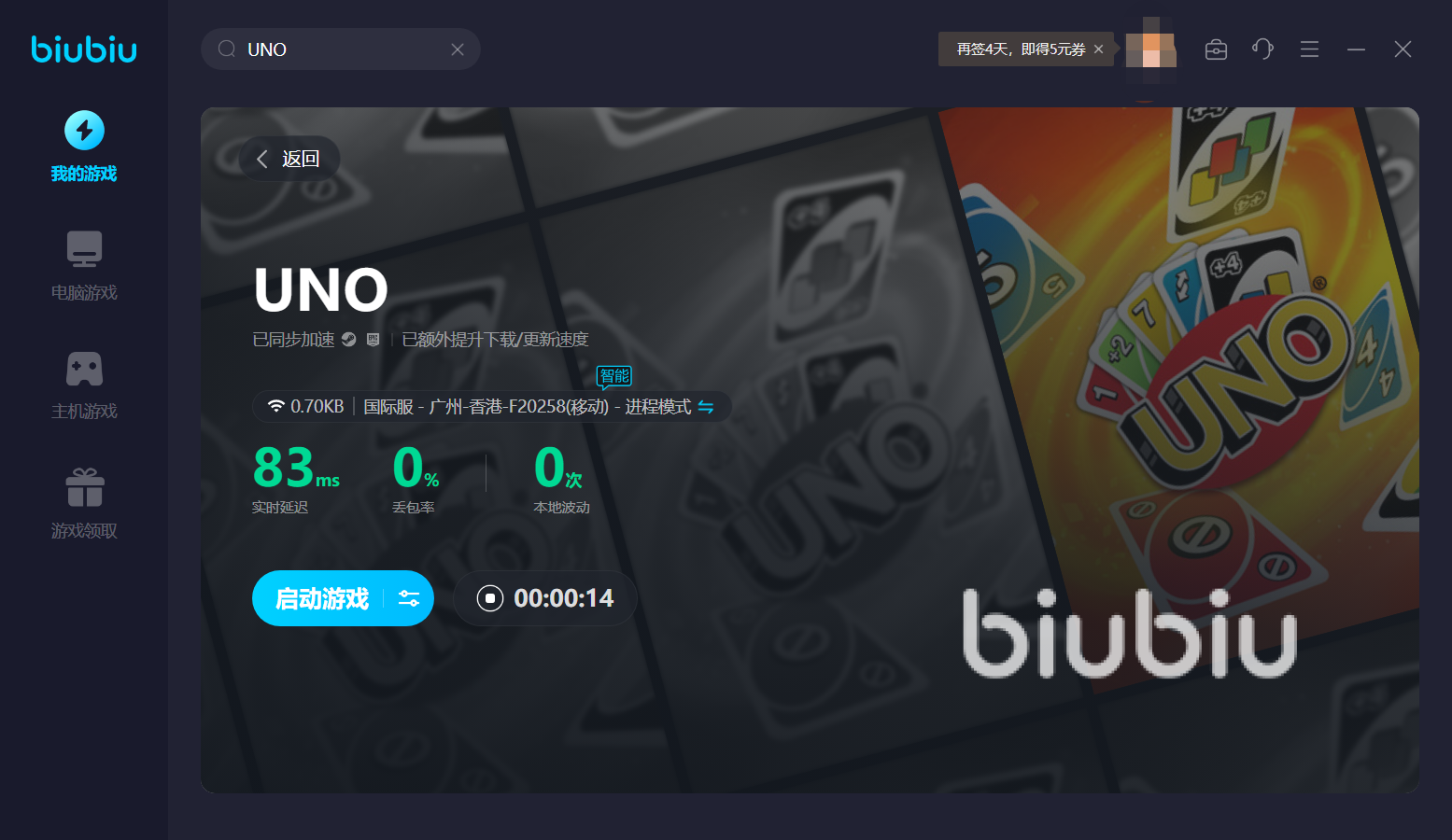 來源: 極光 作者: 大王 2024年04月15日 15:21有不少小伙伴都比較喜歡體驗(yàn)經(jīng)典的卡牌游戲,UNO就是其中比較出名的一款作品,下面的內(nèi)容就讓小編來給大家介紹一下UNO加速器哪個(gè)好用,不少小伙伴在體驗(yàn)這款游戲之后都反映說有卡頓和掉線等現(xiàn)象出現(xiàn),那么找到一款好用的加速器也是大家體驗(yàn)這款游戲至關(guān)重要的步驟,小編把自己喜歡用的biubiu加速器推薦給屏幕前的你們,大家如果有想法的話可以直接點(diǎn)擊按鈕下載這款加速器。