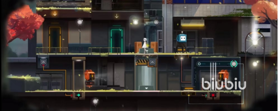 第四個場景進(jìn)來,把一樓桔色機(jī)器人關(guān)住,小伙伴暫時留在二樓,自己先到一樓收集光。打開二樓的綠色安全門,這里沒什么難度,就是一個過渡。出來以后還是把小伙伴放著不動擋住敵方,主角到地方腳底下直接關(guān)機(jī)吸它的源,然后再打開升降梯把小伙伴帶下來。所有燈點(diǎn)亮以后,前方道路修復(fù),樓梯出現(xiàn)就可以走了。