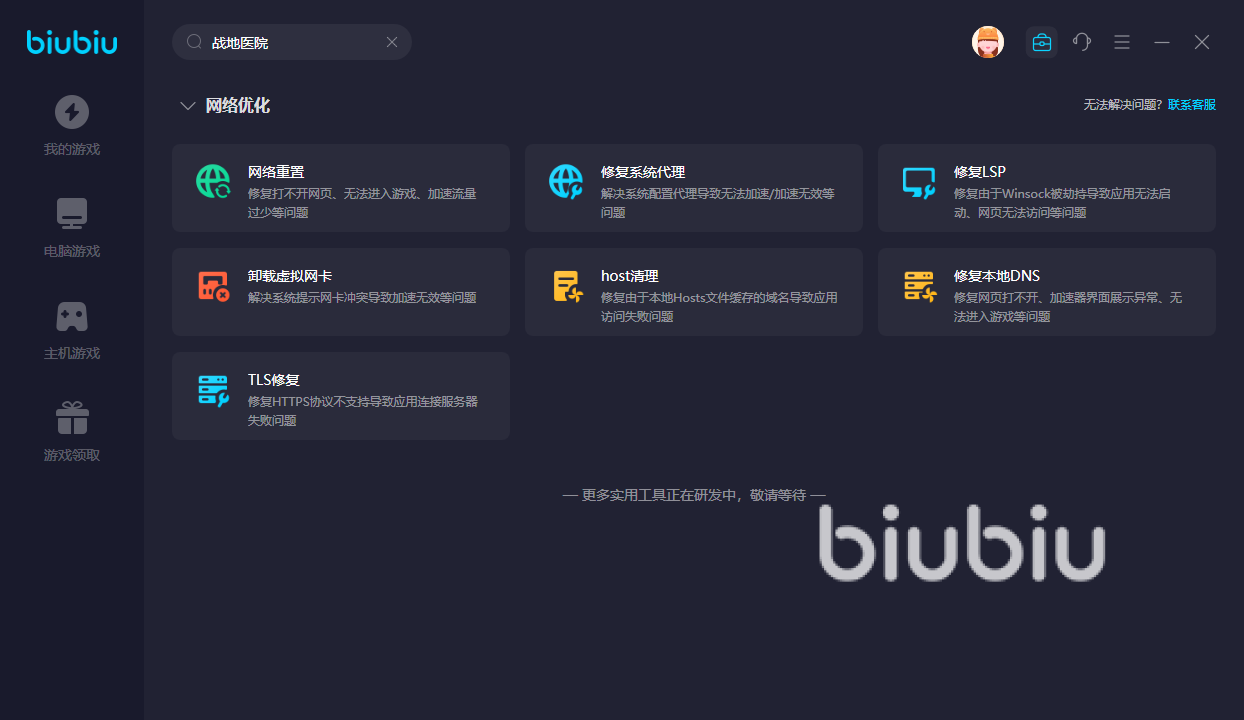 因為游戲內(nèi)本身存在的一些問題,所以還是常備一些修復(fù)工具比較好,但這里就無需大家再去搜索問題解決方法,也不用下載七八款軟件準(zhǔn)備著,因為biubiu內(nèi)自帶有工具箱,這個工具箱里能幫你解決閃退、報錯等至少80%以上的問題,也是眾多游戲內(nèi)再常見不過的一些報錯反饋了。
