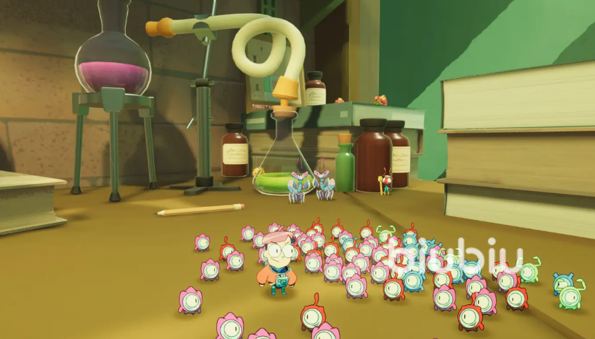 先去找大螳螂亂心智,到了無常綠園以后,我們可以看到一片像實(shí)驗(yàn)室的地方。四處都是綠植,還有很多超大的盆栽。還有大大的生態(tài)箱。緊接著亂心智會(huì)告訴你,他才不會(huì)告訴你他把鑰匙藏在了生態(tài)箱底部。這里能看出來大螳螂是真的很傻。果然不愧叫亂心智。開始前還是要多收集一些小眷靈,新的小眷靈是綠色的,這些小眷靈可以堆疊在一起,還挺有意思的。