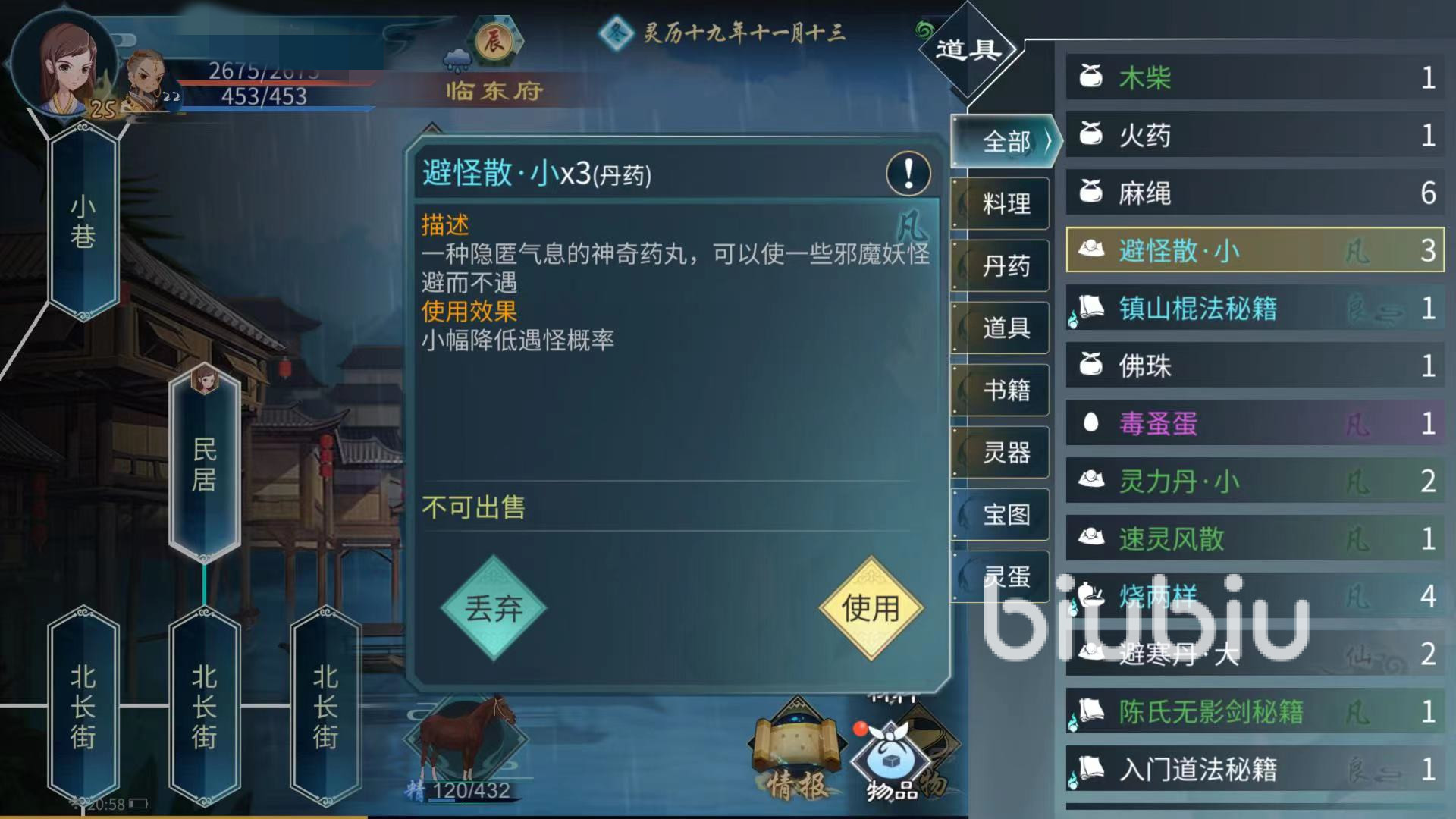 在丹藥中主要可以購(gòu)買(mǎi)避怪丹和避毒丹,避怪丹是一種隱匿氣息的神器,可以使一些邪魔妖怪避而不見(jiàn),可以完全避開(kāi)怪物,這里主要用于一些緊急任務(wù)時(shí),可以使用避怪丹消除一些不必要的挑戰(zhàn),選擇避毒丹是一個(gè)大型的避毒但通過(guò)服用后可以解除小中大型毒素的影響,當(dāng)誤入毒壇時(shí),可以使用避毒丹進(jìn)行提升血量,短時(shí)間內(nèi)解除毒素,否則隨著毒素的不斷加深,可能會(huì)導(dǎo)致血量全失回到陳家村進(jìn)行恢復(fù)。