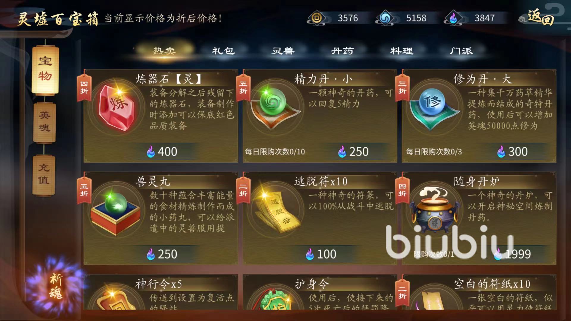 玩家進(jìn)入游戲后,可以在主頁(yè)面中看到商場(chǎng),通過(guò)消耗一定的零食,可以在商場(chǎng)中購(gòu)買(mǎi)各種不同的道具,其中會(huì)不定時(shí)的對(duì)一些道具進(jìn)行打折,比如煉器石,通過(guò)裝備分解之后殘留下的煉氣,裝備制作時(shí)添加可以保底紅色品質(zhì)裝備,通過(guò)消耗400靈石即可獲得一個(gè)煉器石,通過(guò)煉器石可以練就出紅色品質(zhì)以上的裝備,當(dāng)裝備煉制成功后,人物進(jìn)行佩戴,佩戴成功可以提升人物的戰(zhàn)斗力。