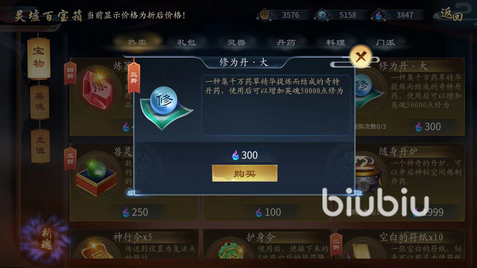 在此處還應(yīng)該購(gòu)買(mǎi)修為單大,此丹藥每日只能購(gòu)買(mǎi)三次,它是一種集萬(wàn)千藥草精華提煉而成的奇特丹藥使用后可以增加英魂5萬(wàn)點(diǎn)修為,通過(guò)消耗靈力值300可以兌換一個(gè)大修為丹人物,通過(guò)服用修為丹后可以迅速提升修為,增強(qiáng)戰(zhàn)斗力,在后續(xù)怪物隨機(jī)出現(xiàn)時(shí),可以進(jìn)行輕松挑戰(zhàn)成功。除此之外還應(yīng)該購(gòu)買(mǎi)逃脫符,逃脫符是一種神奇的符咒,可以100%地從戰(zhàn)斗中逃脫,當(dāng)遇到一些怪獸戰(zhàn)斗力特別強(qiáng)時(shí),可以通過(guò)逃脫服進(jìn)行逃脫避免出現(xiàn)一定的損失。