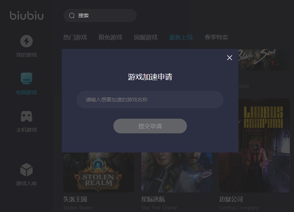 雖然biubiu這款加速器支持的游戲作品有很多,但是難免會(huì)有一些相對(duì)而言比較小眾的游戲沒(méi)有囊括進(jìn)去,不過(guò)也沒(méi)有關(guān)系,如果大家發(fā)現(xiàn)自己游玩的作品在這里找不到,可以在平臺(tái)中進(jìn)行申請(qǐng),一般萊斯或很快就會(huì)加入進(jìn)去供我們暢享了,是不是非常給力呢!