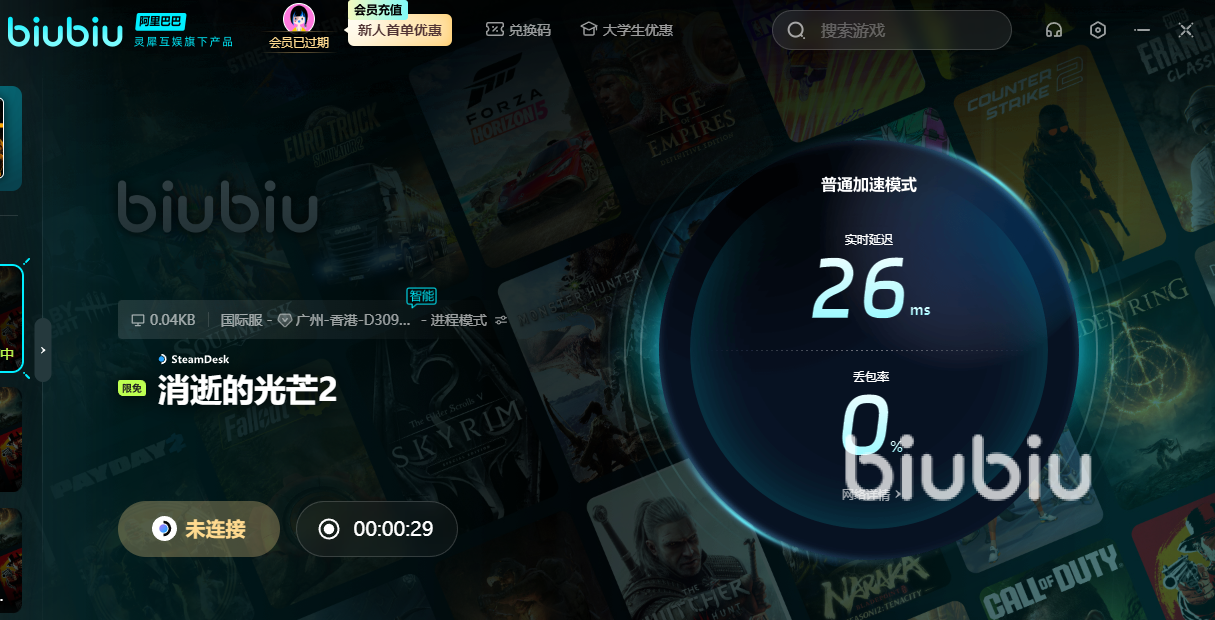 大家可以看到,加速之后延時(shí)數(shù)值很低的,而且丟包率一個(gè)大大的0就代表我們?cè)诰€是很穩(wěn)定的,自然大家是不容易閃退的了。而且還有個(gè)細(xì)節(jié)大家需要注意,可以看到游戲左邊是有限免字樣的,這其實(shí)就是biubiu經(jīng)常有的限免福利哦。