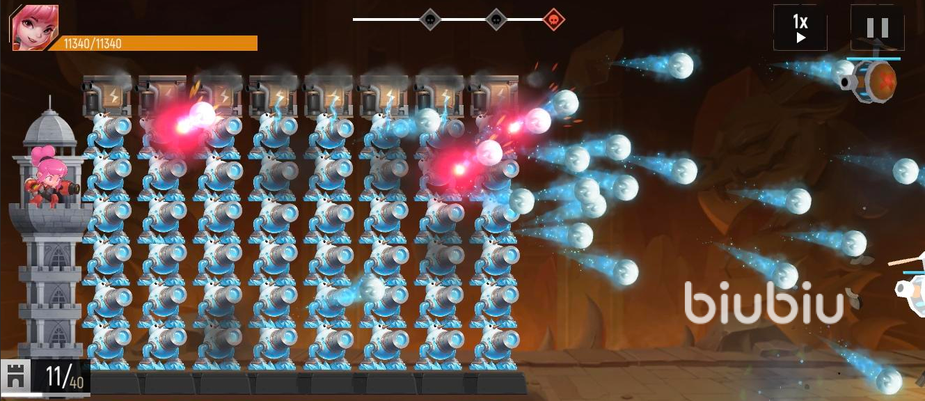 此玩法有點(diǎn)類似于植物大戰(zhàn)僵尸,玩家將在屏幕上放置很多的堡壘以及炮彈攻擊不斷侵襲的怪物。玩家的人物角色將站在最后面進(jìn)行攻擊,如果在規(guī)定時(shí)間內(nèi)能夠擊敗所有的怪物,那么玩家將獲得勝利,如果在時(shí)間內(nèi)玩家被怪物吃掉了,那么則視為挑戰(zhàn)失敗。
