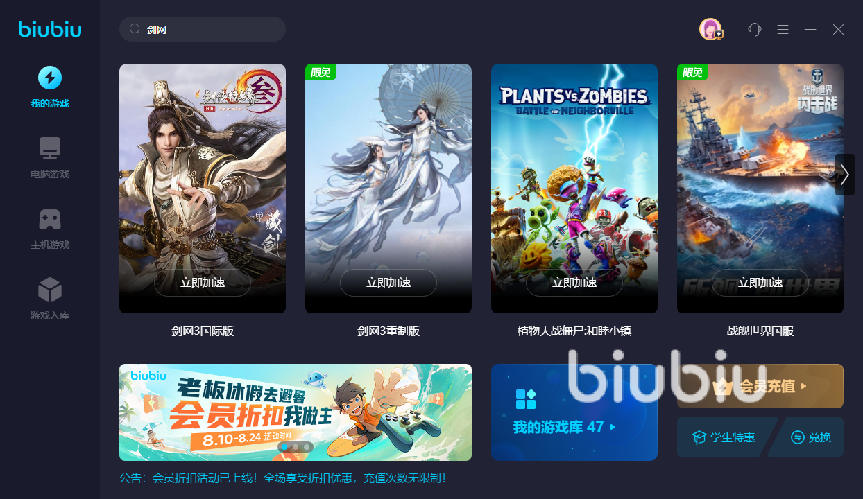 biubiu加速器現(xiàn)在只要是國(guó)服的游戲,都是免費(fèi)加速的,雖然是限時(shí)加速,但是是一個(gè)長(zhǎng)期的活動(dòng),這波福利還不止,只要大家沒用過,下載了biubiu以后第一次登錄就會(huì)直接贈(zèng)送24小時(shí)免費(fèi)加速體驗(yàn)時(shí)間,而且steam和暴雪平臺(tái)的游戲現(xiàn)在也是享受限時(shí)免費(fèi)活動(dòng)的,囊括的游戲非常多。