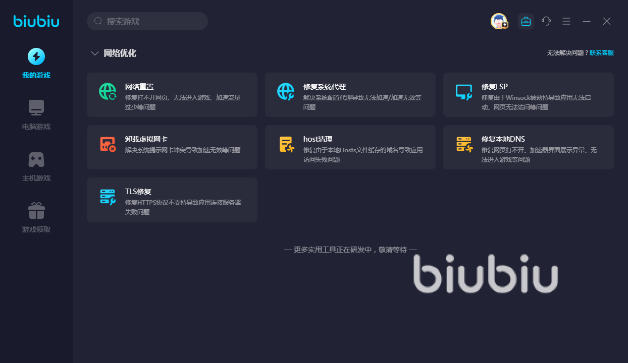 因為游戲版本比較古老,所以很多玩家在運行的時候,系統(tǒng)方面也會存在一些問題,針對這一點,biubiu也推出了很多實用的工具,在工具箱中就可以找到并免費使用。根據(jù)不同的故障類型選擇合適解決辦法,其中主要包括TLS修復(fù),系統(tǒng)代理修復(fù),Lsp修復(fù)等。不需要大家自己動手,只需要點擊相應(yīng)功能就可以自動完成優(yōu)化,這樣也能夠解決很多問題。