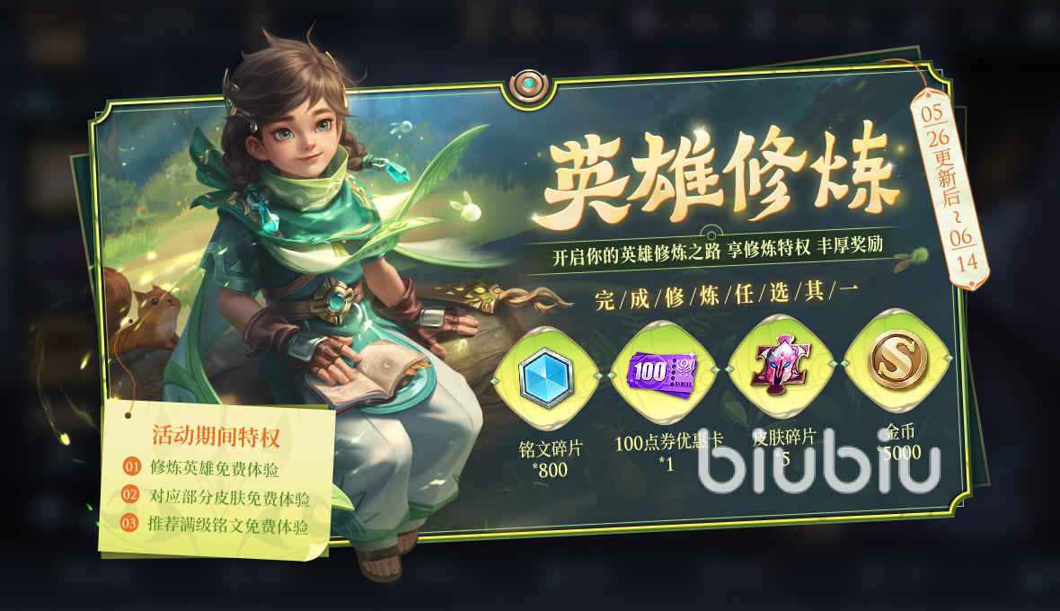 該活動同樣也已上線,將一直持續(xù)到6月14號,小伙伴們完成修煉就能領(lǐng)取獎勵了,而獎勵包括銘文碎片、點券優(yōu)惠券、皮膚碎片等。