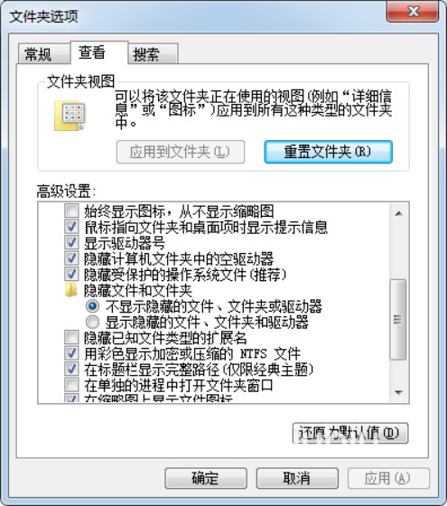 打開(kāi)后,里面會(huì)有一個(gè)文件夾的選項(xiàng)卡,找到這個(gè)選項(xiàng)卡,在里面會(huì)有“顯示隱藏的文件夾”這里急的在上面打上對(duì)號(hào),急的下面點(diǎn)擊應(yīng)用和確定,特別關(guān)鍵,不然會(huì)啟動(dòng)失敗,一定反復(fù)確定一下。