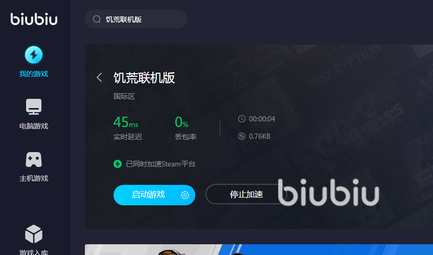 你可以看到加速器效果相當(dāng)不錯,我們也可以在加速的界面中實(shí)時觀察到延遲和丟包的反饋。事實(shí)上,在為游戲本身提供加速服務(wù)的同時,biubiu還將“順便”在網(wǎng)絡(luò)上為我們優(yōu)化游戲平臺,通過這種方式帶給我們更流暢的在線游玩體驗(yàn)。而且加速完成后,我們可以直接在這個界面啟動游戲,不需要切換軟件打開體驗(yàn)也很好很貼心。同時biubiu比起其他加速器,采用了更多線程的加速方法,最大程度上保障用戶使用時的流暢度,使用biubiu加速器游玩饑荒,可以收獲宛如國內(nèi)游戲一般的網(wǎng)速。