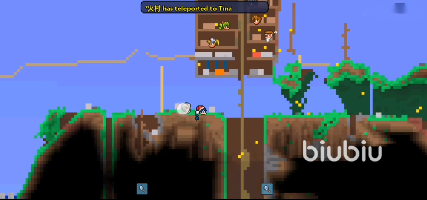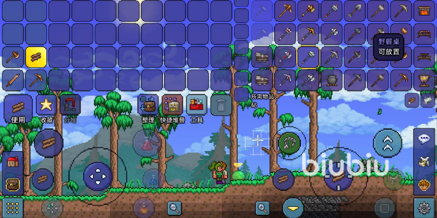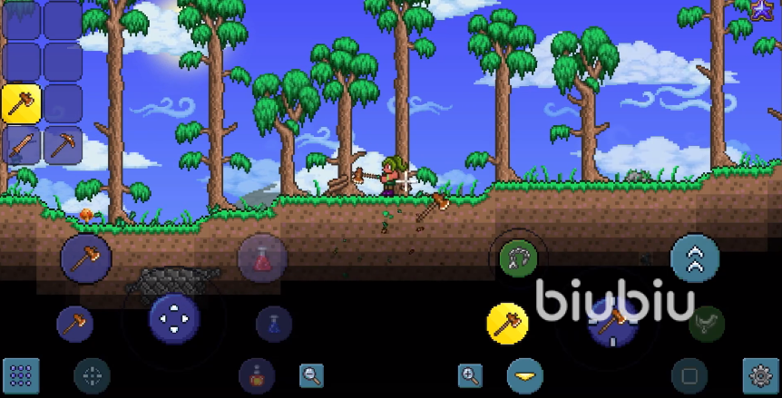 而對于有一定裝備基礎的玩家而言,就可以不適用上面這種效率極低的砍樹方式了。我們可以選擇直接將樹干下方的泥土破開,讓樹木丟失地基,由于泰拉瑞亞手游獨特的重力系統(tǒng),此時的樹干就會倒塌并在地上形成木材掉落物,這個方法可以說是最快的砍樹方法了。