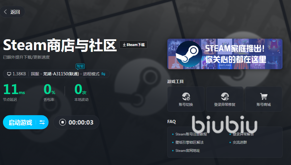游戲目前還未上線,但是我們可以在steam商店看到關(guān)于游戲的內(nèi)容,感興趣的朋友可以登錄查看。若是網(wǎng)速不行的話是無法打開頁面的,所以為了解決掉這個問題,使用一款合適的加速器就變得至關(guān)重要了。小編為大家分享下自己正在用的biubiu加速器,它專業(yè)的電競加速通專線,是能夠優(yōu)化好我們的網(wǎng)絡(luò)連接從而提升大家網(wǎng)絡(luò)速度的。