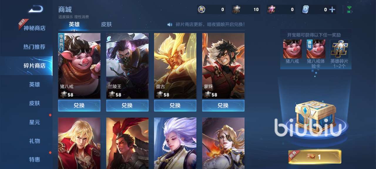 同時大家要記住,該活動最多可以購買八件折扣皮膚,所以大家在選擇其他的皮膚時,一定要仔細(xì)斟酌,除了這個神秘商店更新外,碎片商店也進(jìn)行更新,當(dāng)前最熱門的碎片英雄是豬八戒和蘭陵王,他們在獎池中需要五十八個英雄碎片才可以兌換。