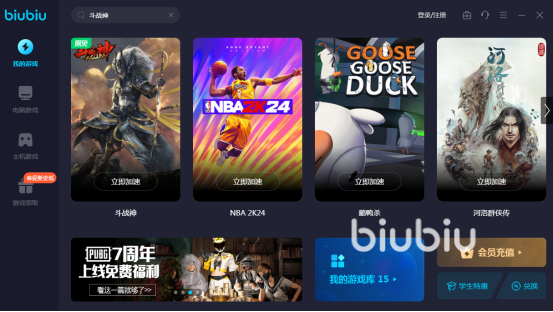 biubiu加速器是很多玩家都比較推薦的,因為它通過下載到電腦桌面上以后,就可完成電腦游戲的加速,支持海量的游戲數(shù)量。不管是喜歡玩斗戰(zhàn)神還是喜歡玩其他類型的游戲,都可進入加速器,通過將游戲的名字輸入其中以后完成加速。
