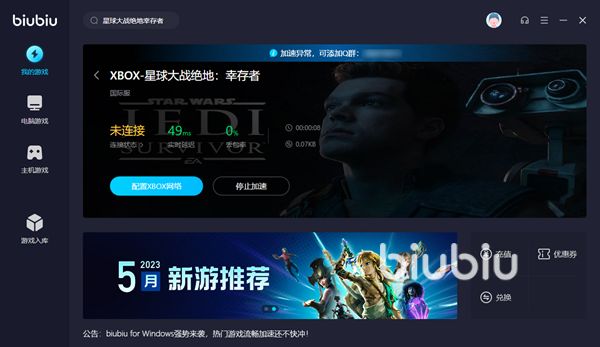 星球大戰(zhàn)絕地幸存者這款游戲除了在PC上發(fā)售之外,也推出了PS以及Xbox兩個(gè)主機(jī)版本,NS版雖然跳票但應(yīng)該也會(huì)在年內(nèi)推出。Biubiu這款加速器有一個(gè)非常棒的地方,那就是除了支持PC游戲的加速之外,也提供了一部分主機(jī)游戲的網(wǎng)絡(luò)修復(fù)以及優(yōu)化服務(wù)。點(diǎn)擊文中鏈接下載軟件打開之后我們?cè)赽iubiu中搜索游戲名稱,就可以看到目前這款加速工具就對(duì)兩個(gè)主機(jī)版本的星球大戰(zhàn)絕地幸存者提供了支持,相信未來(lái)也會(huì)第一時(shí)間加入對(duì)switch版本的服務(wù)。