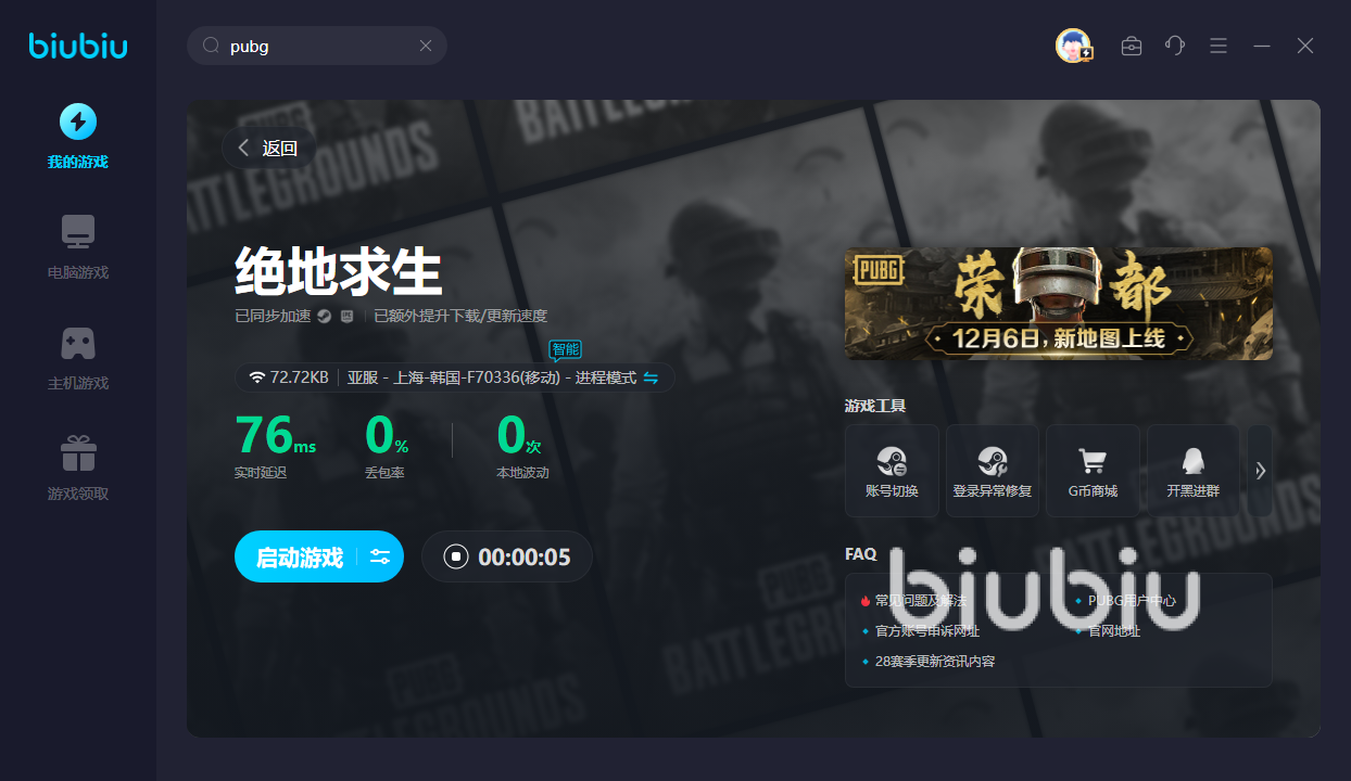 來源: 極光 作者: Roran 2024年03月08日 14:22Pubg也叫做絕地逃生,是知名的吃雞類游戲,但有時玩著會卡。那么pubg卡在進(jìn)入畫面怎么解決?之所以會卡在進(jìn)入的畫面中,主要因?yàn)榫W(wǎng)絡(luò)不好,這時可運(yùn)行biubiu。就能獲得極速網(wǎng)絡(luò),從而解決卡頓的情況。讓你順利地加載出每一幀畫面,從而不會卡住。方能在后續(xù)地對戰(zhàn)中繼續(xù)斬獲勝利,而不是玩到一半就沒了。