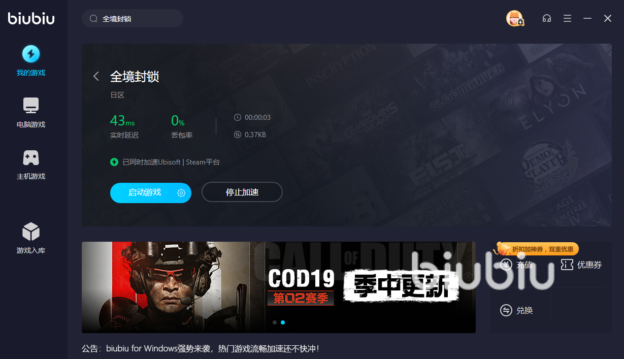 那么今天小編為大家?guī)Я说娜撤怄i1加速器推薦就介紹到這里啦,biubiu加速器除了全境封鎖1之外,還支持著上千款游戲的加速服務(wù)哦!如果小伙伴是一位多面游戲手的話,那么biubiu加速器就更加劃來了,biubiu加速器的各種福利等待著各位小伙伴們前來挖掘哦!那么我們有緣再見!