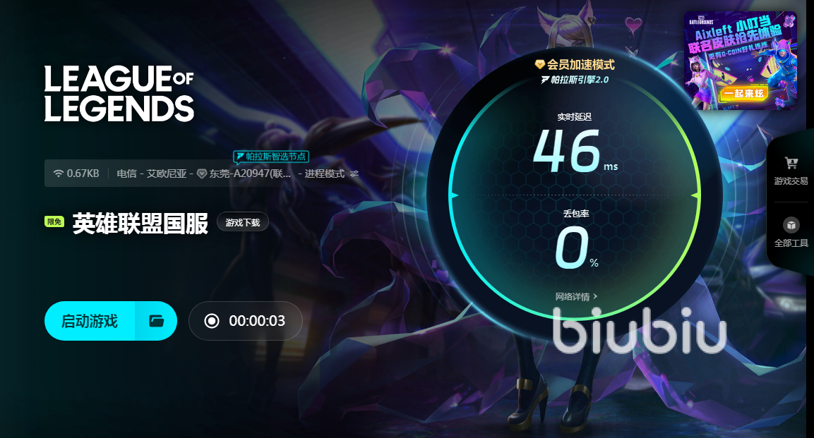 作為一款節(jié)奏非常激烈的競技對戰(zhàn)類游戲,在lol中網(wǎng)絡(luò)將起著非常重要的作用,很多高手玩家都會關(guān)注自身的延遲,因為在延遲高的時候是很影響操作的。例如大家想要打出一套連招,如果中途因為稍微卡頓一些導(dǎo)致錯過節(jié)奏,那就很有可能成為送人頭。在一些高水平的對戰(zhàn)中,這是非常影響戰(zhàn)績的,而且還會導(dǎo)致和隊友出現(xiàn)矛盾,所以每個玩家都不希望遇到。尤其是在游戲更新之后,容易出現(xiàn)卡頓情況,甚至無法正常運行。造成這樣的問題的原因有很多,大概率是因為更新之后,同時上號比較多,所以會導(dǎo)致服務(wù)器比較堵,或者是其他原因都有可能。解決方法就是使用biubiu來運行游戲。Biubiu可以幫助進(jìn)行網(wǎng)絡(luò)優(yōu)化,輕松解決卡頓延時高等問題。