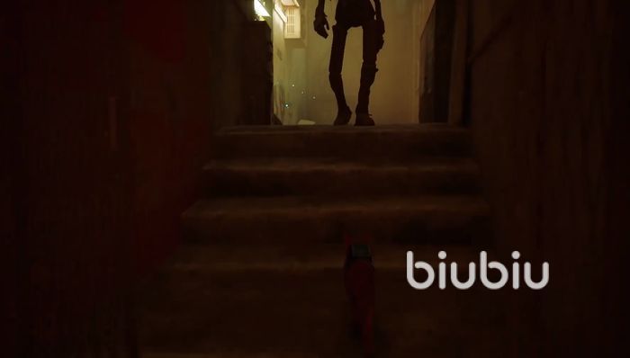 進(jìn)入之后向右拐,然后盡頭向左拐,等到進(jìn)入到黑暗的地方,大家注意放慢腳步,這個(gè)時(shí)候可以看到右側(cè)是有個(gè)樓梯的,我們直接走過去。然后會(huì)有一個(gè)機(jī)器人下來,大家注意別走錯(cuò)路了。主要是黑暗路段的樓梯很多玩家都非常容易忽略。