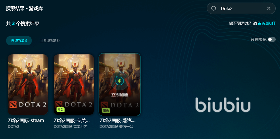 現(xiàn)在的加速器軟件也不像以前那么復(fù)雜難用,biubiu加速器用起來非常簡單,啟動并登錄客戶端后,直接在右上角的搜索框輸入“Dota2/刀塔2”就可以檢索到游戲。可以看到有國際服steam、國服完美世界、國服蒸汽平臺三個區(qū)服,大家根據(jù)自己的需求去選擇,其刀塔2國服還提供了限時免費加速。選定游戲后點擊就可以立即加速,也會同步加速對應(yīng)的平臺。