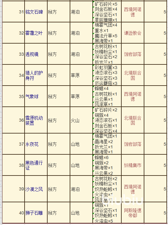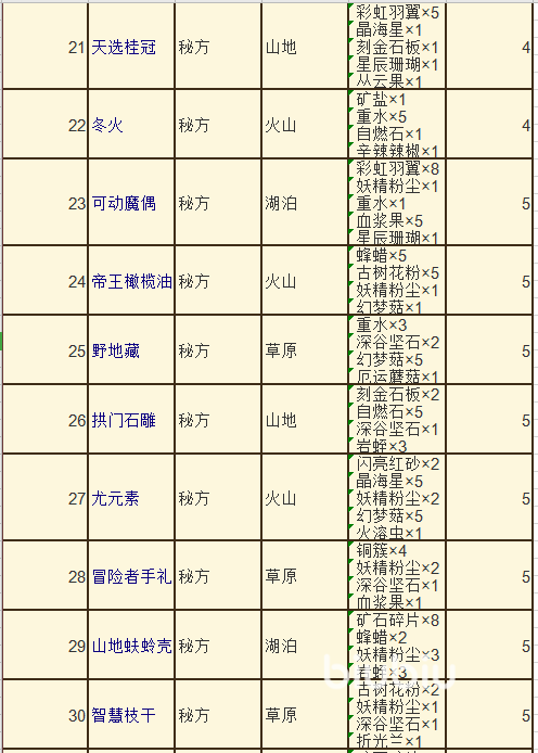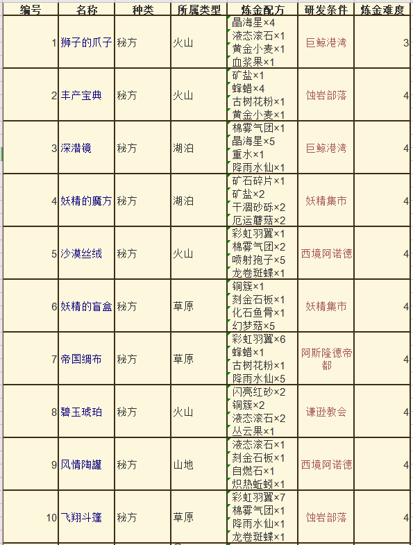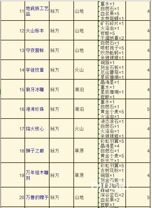 在下方是40個秘方配方的完整分享,可以查看秘方中的材料,提前做好準(zhǔn)備,獲取到秘方后就可以制作出對應(yīng)產(chǎn)物了。
