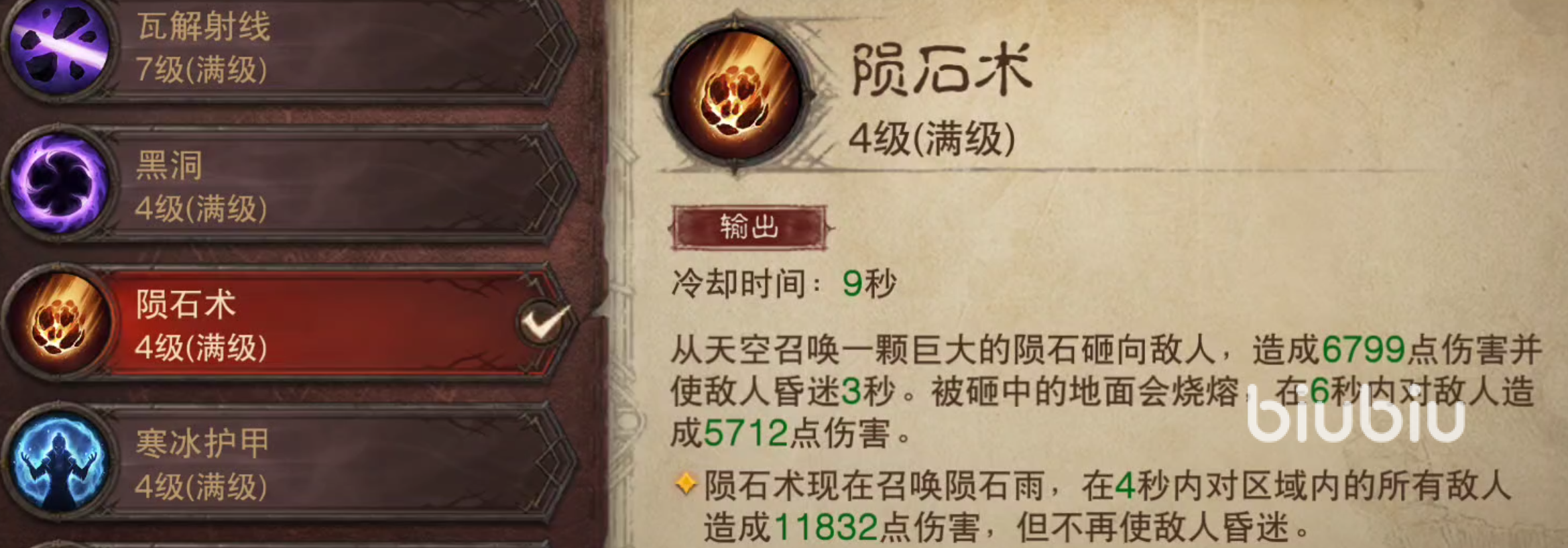 第1個技能選擇魔法飛彈,技能效果就不用再多說了,常用的輸出技能,第2個技能選擇灼燒之球,這些法師在刷怪時最常用的技能,小怪可以直接清理掉,使用起來也很簡單。第3個技能選擇隕石術,這個技能非常重要,是這一套流派中唯一的控制技能。在使用時需要預判一下石頭落下的時間和對方的走位。只要能夠打準,強力的控制會讓對方痛不欲生。