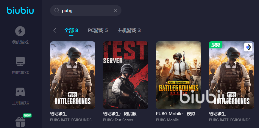 像biubiu就是一個很好的選擇,因為它操作起來非常方便,只要登錄PC端就可以看到多個游戲分區(qū),找到自己喜歡的進(jìn)行體驗。當(dāng)然大家的目標(biāo)明確,就是要玩絕地求生,所以找到搜索欄輸入名字就行了,不管英文還是中文,都可以快速查找出來。