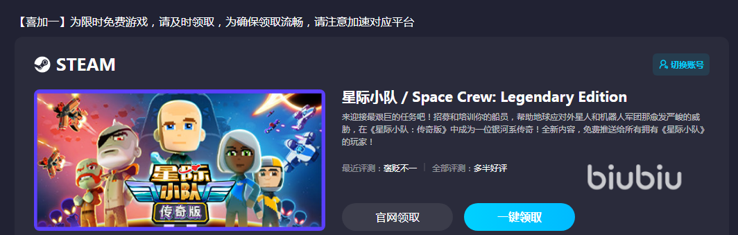 大家還能在biubiu里領到免費的steam游戲,關注游戲領取板塊當中的喜加一,這里的游戲不定期更新,大家每天都可以看一看,也可以勾選上新提醒,這樣就能及時收到上新推送,不用擔心錯過新游戲了。