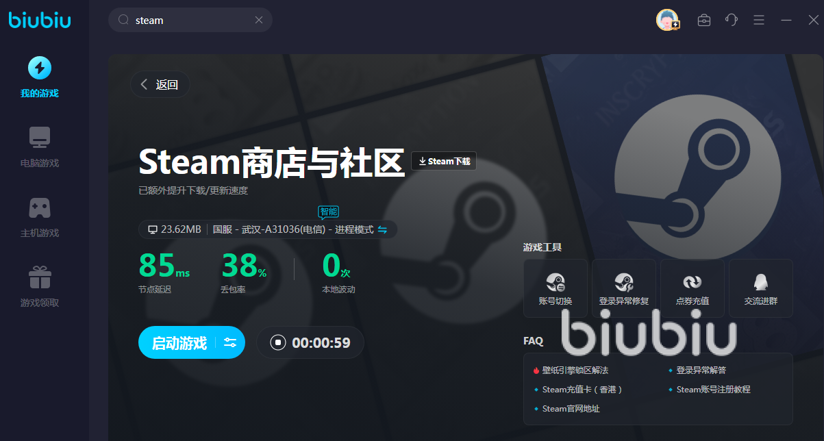 不管你是玩游戲卡還是登錄steam卡,都可以通過biubiu把它給解決掉。只要開啟加速,系統(tǒng)就會自動連接就近的節(jié)點優(yōu)化網(wǎng)速,它能將網(wǎng)速提升到KB單位,并且一直保持這個速度來玩游戲。網(wǎng)速會同步到steam平臺上面,這樣大家后續(xù)瀏覽商店或者是玩游戲也很順暢了。