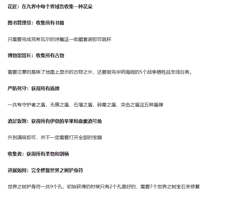 首先就是很重要的劇情挑戰(zhàn)了,只要我們認(rèn)真的完成主線劇情,就可以拿到不少的成就,這個(gè)過程中,還可以得到跟場景探索有關(guān)的能力,收益還是比較大的。下圖列出來的獎杯,就是我們完成章節(jié)挑戰(zhàn),打敗熊,雷神,神秘的女武神等諸神之后,可以正常得到的成就。
