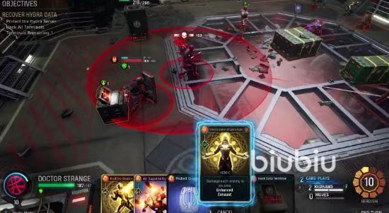 此外在對(duì)局內(nèi)奇異博士還可以為自身或者是其他隊(duì)友提供一個(gè)隱匿的效果,如果進(jìn)行升級(jí)強(qiáng)化,在隱匿期間還可以額外進(jìn)行治療和加速,并且減少英雄卡牌的消耗。