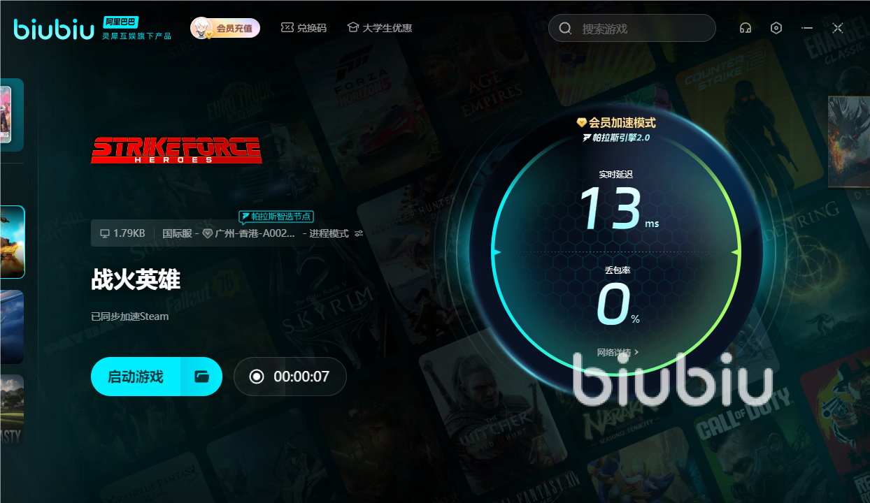biubiu加速器新用戶在玩戰(zhàn)火英雄的時候遇到延遲的話可以直接在平臺上面領(lǐng)取免費的24小時加速時長,任何一個新注冊的用戶都能夠享受到這個福利。如果不夠的話,可以使用兌換碼【biubiu不卡頓】再領(lǐng)取多72小時的免費時長,這個福利一般人我可不告訴他們哦。