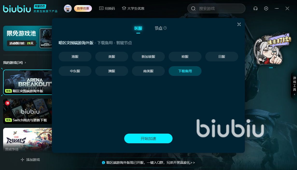 下載開始前請注意游戲包體高達51.9G,因此建議你最好準備100G的存儲空間,以體驗游戲的最佳效果。此外,由于下載過程可能會耗費一定時間,你可以使用biubiu加速器來加快下載速度。特別提醒,暗區(qū)突圍在biubiu首月限免,所以你可以盡情享受游戲帶來的樂趣,選擇下面的【下載備用】節(jié)點,就可以最高提速500%了。