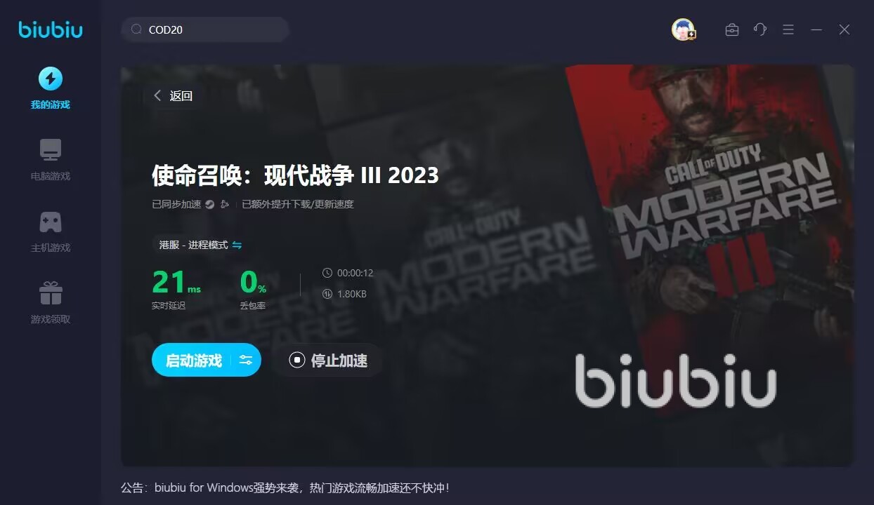 有關使命召喚現代戰(zhàn)爭三2023閃退解決辦法就為大家聊到這,若是你直連經常會出現這種情況,還是讓biubiu來幫你吧,其它的各種海內外游戲它也同樣可以兼容,有了它你玩游戲再也不用擔心被網絡問題所困擾了。