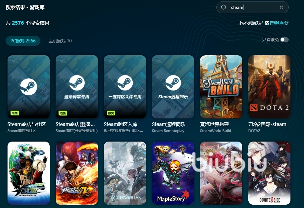 值得一提的是,biubiu的操作上也十分的便捷,通過首頁,可以發(fā)現(xiàn)它支持的游戲種類豐富多樣。一鍵即可針對喜歡的游戲來進(jìn)行優(yōu)化,此外目前針對Steam平臺,更是有著限免加速的福利,讓大家即便不充值也能去使用它,助力小伙伴們獲取更好的游戲體驗(yàn)。