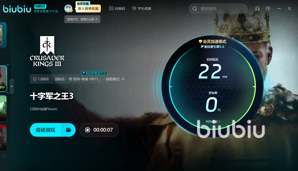 十字軍之王3作為國(guó)際知名大作,尚未開始推出國(guó)服。所以打算進(jìn)階十字軍中的統(tǒng)治者,就得用上biubiu。加速過(guò)后才能跨越幾個(gè)世紀(jì),讓你來(lái)到新的家族或者國(guó)度中。新用戶的話可以領(lǐng)取24小時(shí)的免費(fèi)加速,另外新老用戶輸入【biubiu不卡頓】,就能額外獲得三天免費(fèi)加速。如果在發(fā)展途中太卡,就會(huì)限制你的擴(kuò)張速度。使用加速器后,就能避免卡頓,能夠無(wú)限制的擴(kuò)張。要是與人開戰(zhàn)時(shí)延遲過(guò)高,就無(wú)法及時(shí)做出周全的準(zhǔn)備。有了加速器后,就能降低延遲,及時(shí)做好各種準(zhǔn)備。